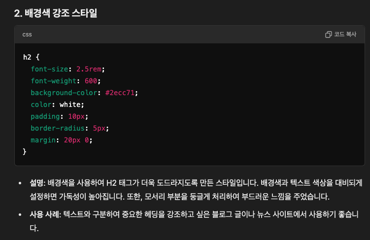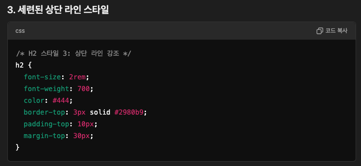 h2와 h3 태그의 CSS 스타일링에는 다양한 접근 방식이 있습니다. 웹 개발과 HTML, CSS에 익숙한 사람들은 이를 쉽게 할 수 있지만, 그렇지 않은 이들에게는 다소 도전적일 수 있습니다. 그러나 ChatGPT를 활용하면, 복잡한 코딩 지식 없이도 간단한 명령어만으로 자신만의 독특한 h2, h3 태그 디자인을 만들 수 있습니다. 이는 웹 디자인을 더욱 접근하기 쉽고 효율적으로 만들어 줍니다.